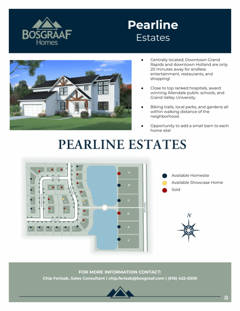 Centrally located between Grand Rapids and the Lakeshore, take advantage of all West Michigan opportunities to live, work and play in Pearline Estates! Downtown Grand Rapids is just 15 miles away for easy access to shopping, restaurants and endless entertainment. Close to top ranked hospitals, companies and universities for the best in healthcare, employment, education and cultural events. Walking distance to the award-winning Allendale Public Schools and all of its activities and events. Small neighborhood with extra-large home sites for a “country feel.” Opportunity to add a small barn to each home site for all of your toys!