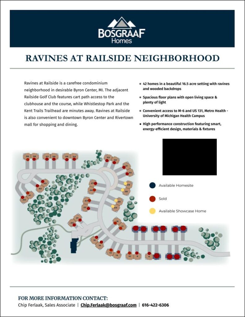 COMMUNITY CLOSE-OUT! LAST CHANCE, LIMITED AVAILABILITY! This stunning condominium community sits right on the edge of the Railside Golf Course. With many luxuries, including access to a golf cart path, and included social membership, a 3rd stall garage option, a uniquely beautiful 16.5-acre setting, and an exclusive community, these homes are sure to impress. Within the condominiums, there are many premium finishes throughout the home including designer flooring, lighting, and fixtures. The adjacent Railside Golf Club features cart path access to the clubhouse and the course, while Whistlestop Park and the Kent Trails Trailhead are minutes away. Ravines at Railside is also convenient to downtown Byron Center and Rivertown mall for shopping and dining.