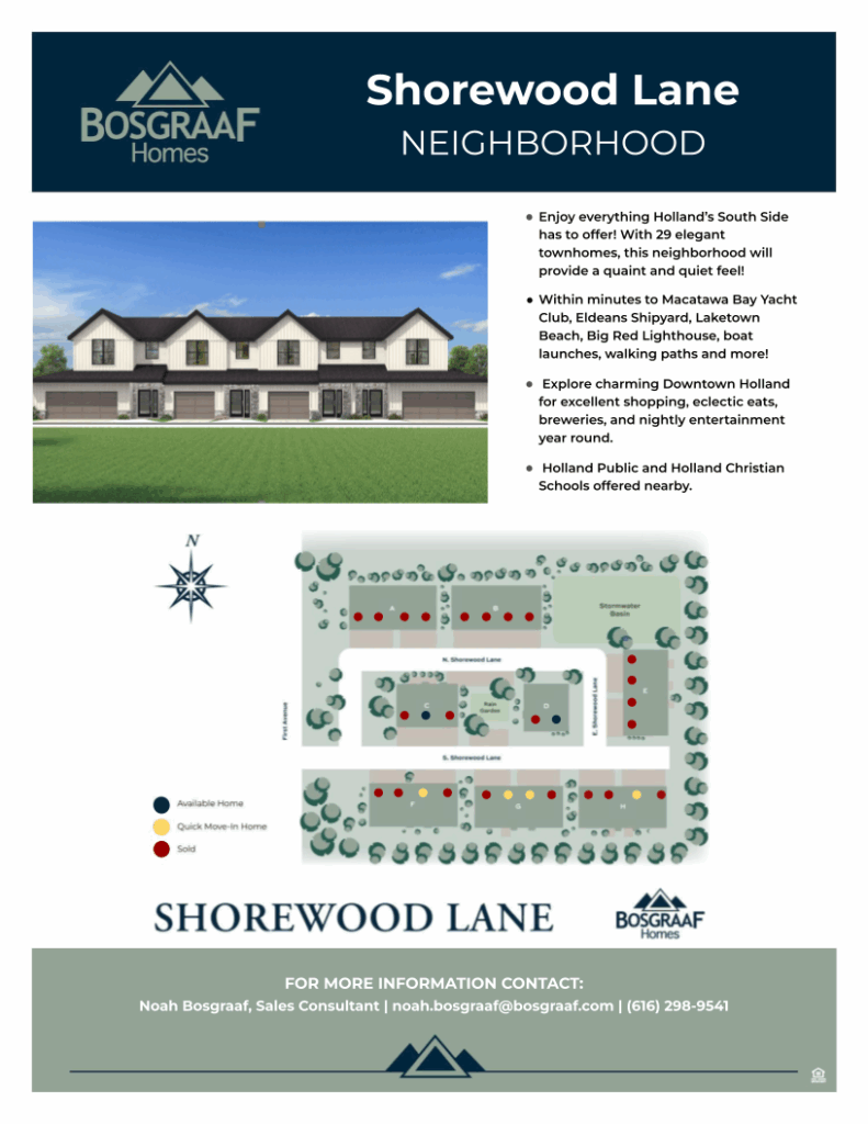LIMITED AVAILABILITY, GOING FAST! Welcome to the life you have been dreaming about at Shorewood Lane by Bosgraaf Homes. Within minutes to Macatawa Bay Yacht Club, Eldeans Shipyard, Laketown Beach, Big Red Lighthouse, boat launches, walking paths and MORE! With 29 elegant townhomes, this neighborhood will provide a quaint and quiet feel, perfect for any family looking to enjoy everything Holland South Side has to offer. Don’t wait! These beautiful townhomes will go quick!