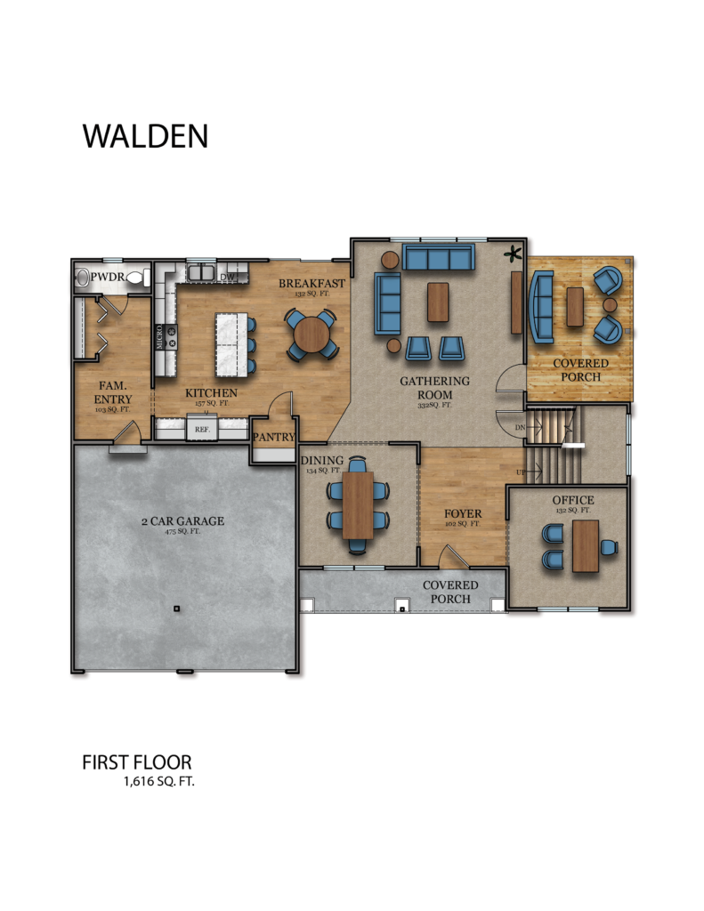 A Fine Example of style and flexibility, the two-level Walden design is perfect for families seeking plenty of options and refined space for living and entertaining. From the covered front porch, step inside to a home that is, at once, grand yet inviting. To your left, a uniquely cozy sunken den, to your right a formal dining room, poised to assist with holiday meals and other entertainment. Straight ahead, the sun-splashed gathering room is bathed in light from its large windows. The kitchen boasts a spacious walk-in pantry, with room to a personalized wine cellar, perhaps; or extra kitchen gadget storage. A covered deck completes the main floor. Upstairs are four bedrooms, including a large owner’s suite with dual sinks and his and her walk-in closets. Another unique feature, an upstairs den, provides an ideal location for a home office or video game arcade. A convenient 2nd-floor laundry finishes the list of Walden’s extensive features and extras for space- and design-loving families who call it home.