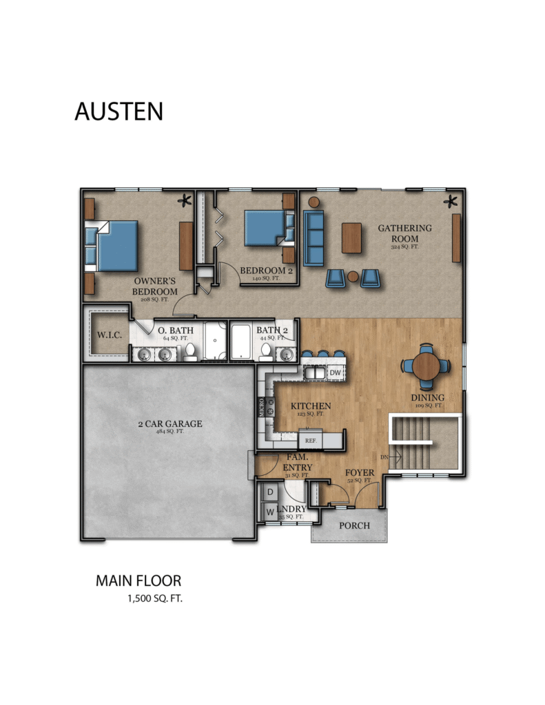 We almost had too much fun designing the perfect little ranch home that is BIG on style. But we did just that, and we delivered BIG with the all new Austen plan. Featuring maximized living and storage space for families big and small. The main floor of the Austen is so open and inviting you’re pulled into the roomy kitchen, dining room and Gathering Room almost immediately. You almost missed the fact that you passed by a beautiful soaring stairway, a coat closet, main floor laundry and family entrance. Not only is there room to seat 12 in the dining room for special occasions, the main floor also features two bedrooms and two full baths including a roomy master suite complete with a private bath and walk in closet. The Lower level can be finished to add one of our most spacious recreation rooms ever! Think you can’t fit a full wet bar, game table and movie theater into one little ranch home…think again! With the option to finish another bath and two more bedrooms in the lower level, this little Austen is clearly BIG on space for the whole family.