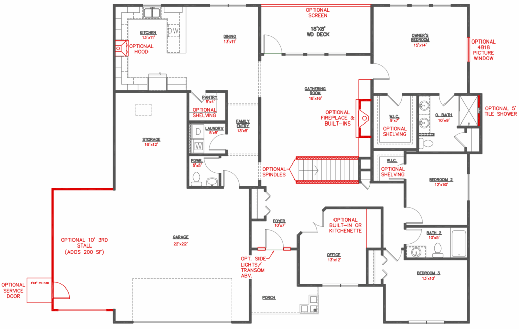 You don’t need more stories to make plenty of room for memories. The expansive ranch design of the Emerson puts a great deal of home on one floor, including an owner’s suite that’s nothing short of a private retreat, with his and her vanities and a walk-in closet. Two or three additional spacious bedrooms on the first floor, make it easy to keep the family connected—everyone’s on the level! Stroll the main floor’s vast square footage, and you’ll notice the many details that elevate Emerson’s grand scale to upscale, all at an affordable price: arched hallways; family entrance with (optional) lockers and benches; kitchen with snack ledge; and an inviting gathering room, bathed in light from its many windows. Outside, the deck provides sliding door access from both the kitchen and owner’s suite, while the garage offers a surprise … a third stall tandem garage. This space-saving design delivers storage without taking up more homesite. Finally, for even more living area, the lower level awaits your optional investment in two additional bedrooms, a full bath and a huge rec room with serious space for some fabulous fun. The Emerson could be the have-it-all home you’ve always wanted!