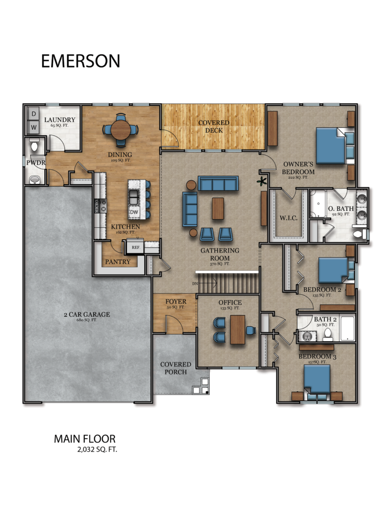 You don’t need more stories to make plenty of room for memories. The expansive ranch design of the Emerson puts a great deal of home on one floor, including an owner’s suite that’s nothing short of a private retreat, with his and her vanities and a walk-in closet. Two or three additional spacious bedrooms on the first floor, make it easy to keep the family connected—everyone’s on the level! Stroll the main floor’s vast square footage, and you’ll notice the many details that elevate Emerson’s grand scale to upscale, all at an affordable price: arched hallways; family entrance with (optional) lockers and benches; kitchen with snack ledge; and an inviting gathering room, bathed in light from its many windows. Outside, the deck provides sliding door access from both the kitchen and owner’s suite, while the garage offers a surprise … a third stall tandem garage. This space-saving design delivers storage without taking up more homesite. Finally, for even more living area, the lower level awaits your optional investment in two additional bedrooms, a full bath and a huge rec room with serious space for some fabulous fun. The Emerson could be the have-it-all home you’ve always wanted!